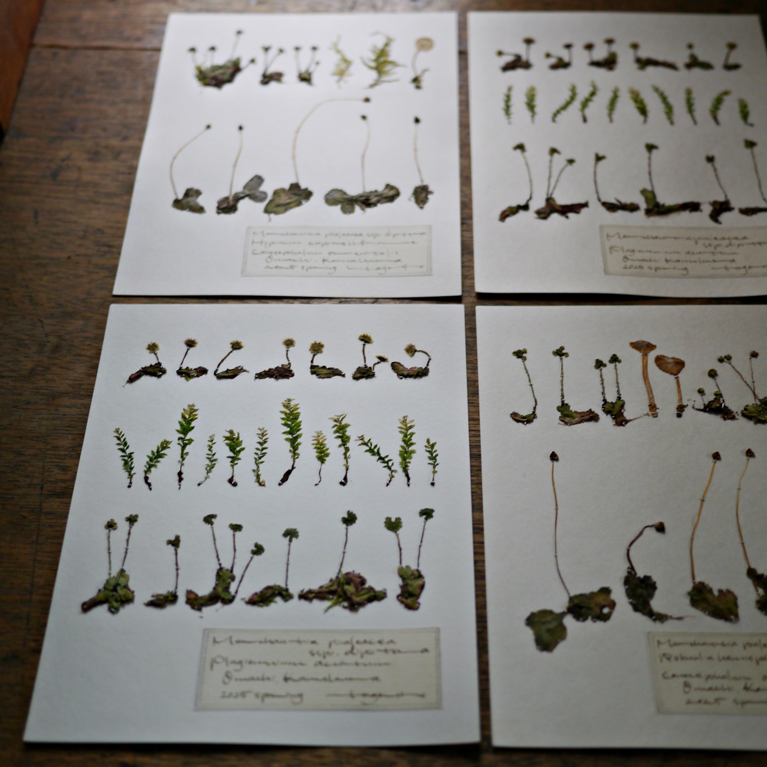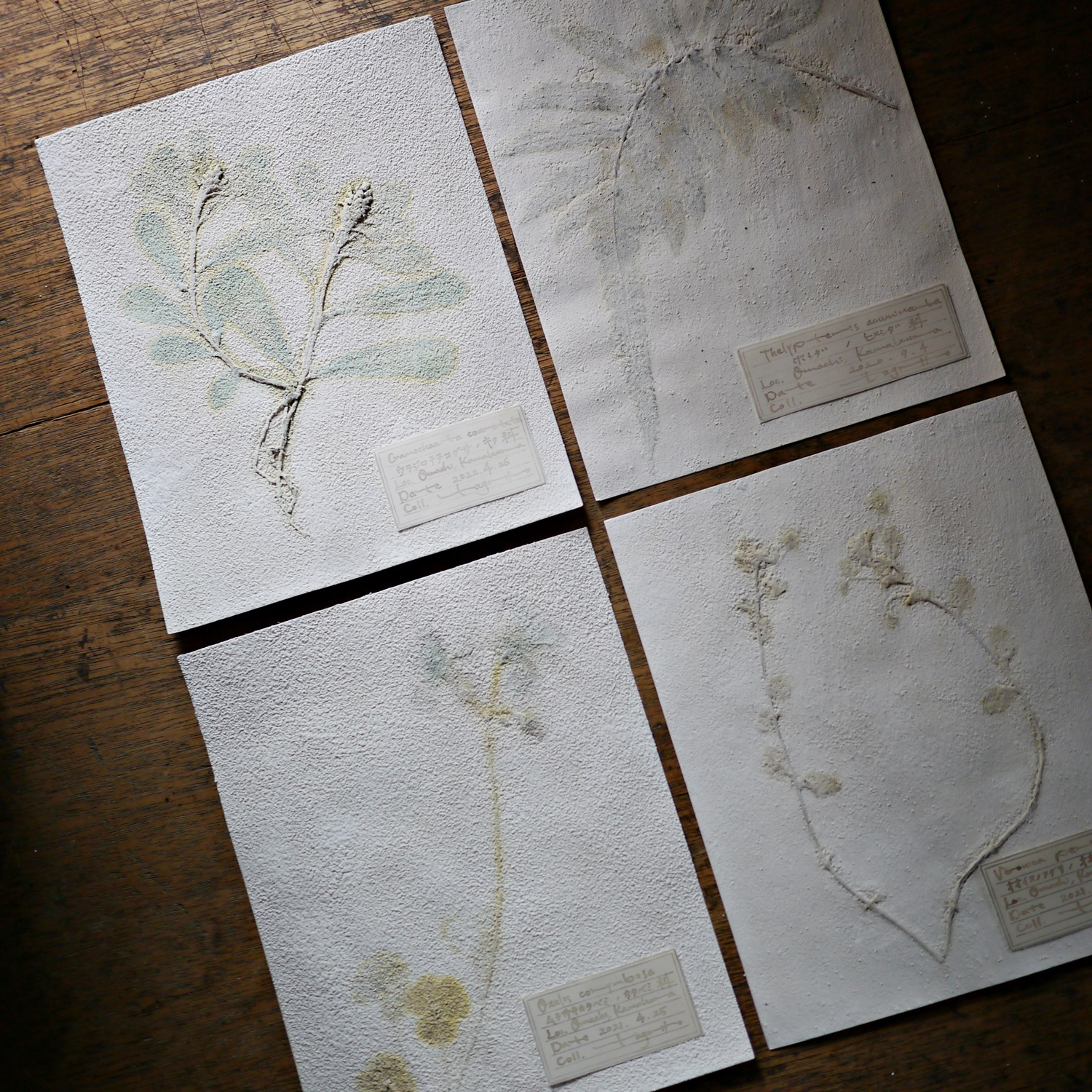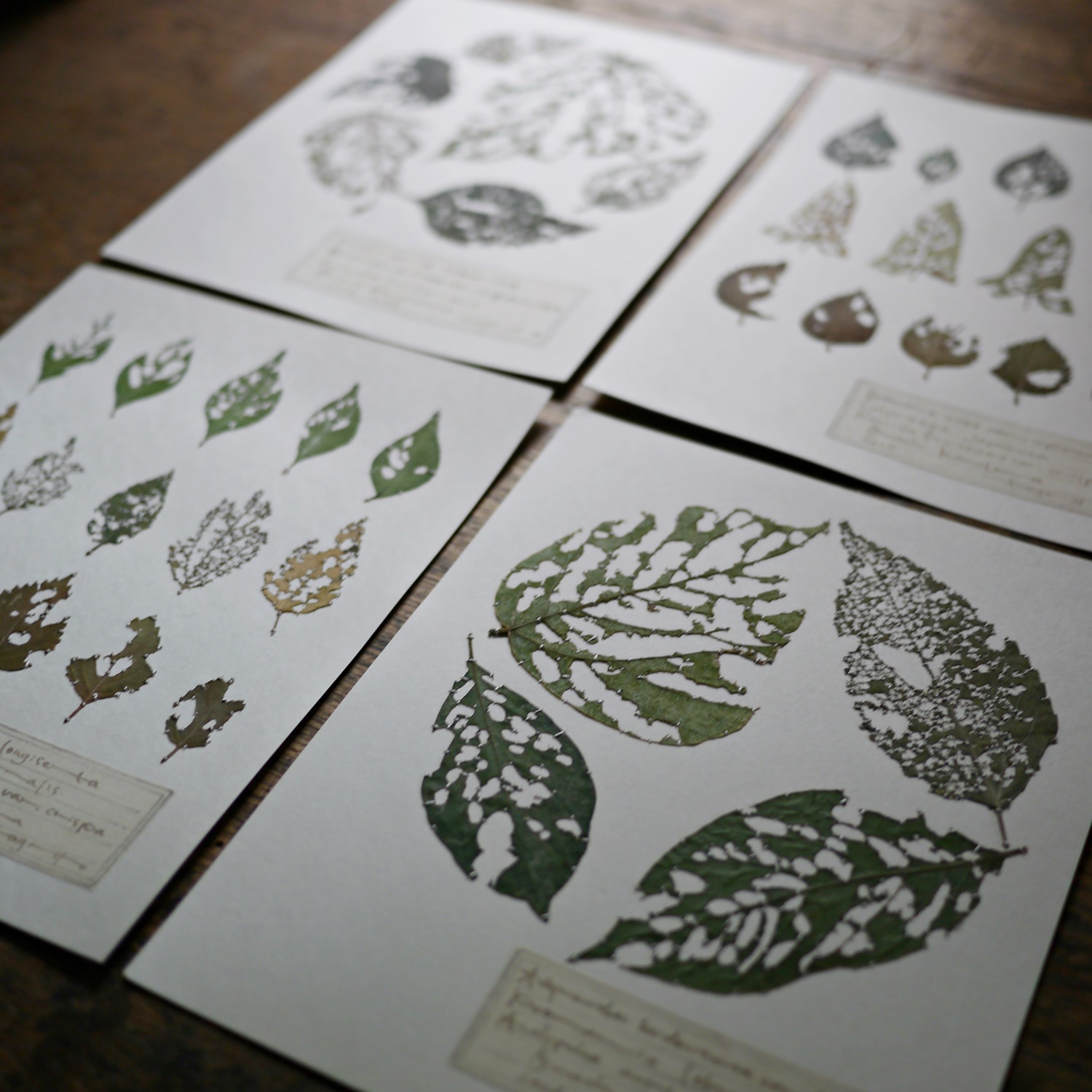 今回は雑草、シダ、コケの標本、虫食葉標本のほか、初期の標本に卵殻などで作った顔料を塗った化石化標本や、植物の欠片を用いた小作品も用意しています。